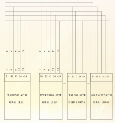 XY―2型系列產(chǎn)品廣泛應(yīng)用于冶金、電力等行業(yè)的有線對講系統(tǒng),在天車上其主站安裝在司機室,分站可以分布在電力室內(nèi)、高壓室、大小車上和天車登機門。該系統(tǒng)由若干臺廣播對講機組成一個機內(nèi)通訊網(wǎng)絡(luò),各個有線廣播站內(nèi)置揚聲器和送受話器,任何一個廣播站喊話,其余話站均能接通廣播。可以使生產(chǎn)人員方便地與天車操作人員取得聯(lián)系。在各個站操作時無需撥號,可以方便的實現(xiàn)一對一講話,各話站并列接線,用戶可根據(jù)工藝要求任意擴充,每個話站都是一個獨特的系統(tǒng),任一臺損壞,不會影響其余分站正常工作。在起重設(shè)備上可以方便地實現(xiàn)上下車聯(lián)系,機內(nèi)操作人員相互通訊。接線原理框圖參見附錄。