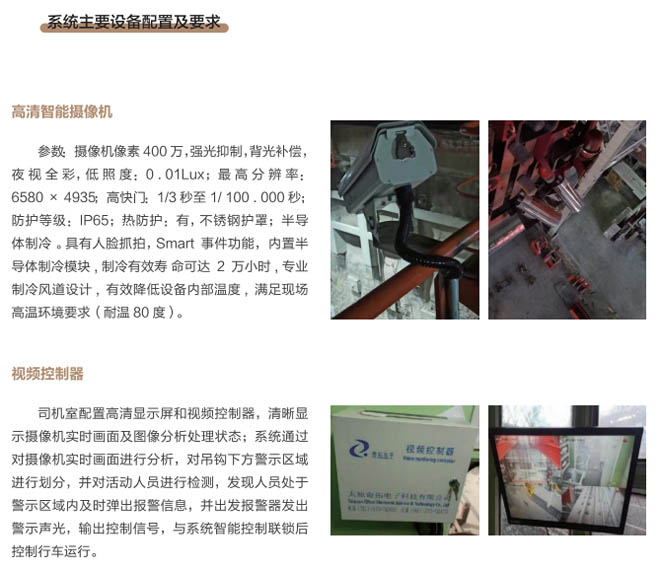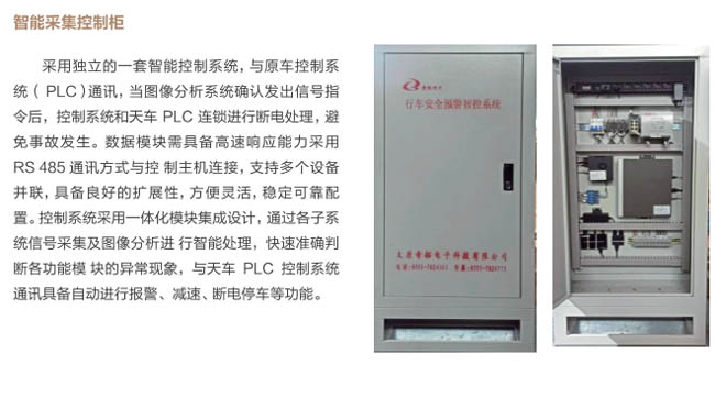 6、行車智控系統(tǒng):控制系統(tǒng)采用一體化模塊集成設(shè)計, 通過各子系統(tǒng)信號采集及圖像分析進(jìn) 行智能處理,快速準(zhǔn)確判斷各功能模 塊的異,F(xiàn)象,與主機(jī)PLC控制系統(tǒng) 通訊連接具備自動進(jìn)行報警、減速、斷電停車等功能,當(dāng)系統(tǒng)確認(rèn)發(fā)出信號指令后,控制系統(tǒng)和行車PLC連鎖進(jìn)行斷電處理,避免事故發(fā)生。